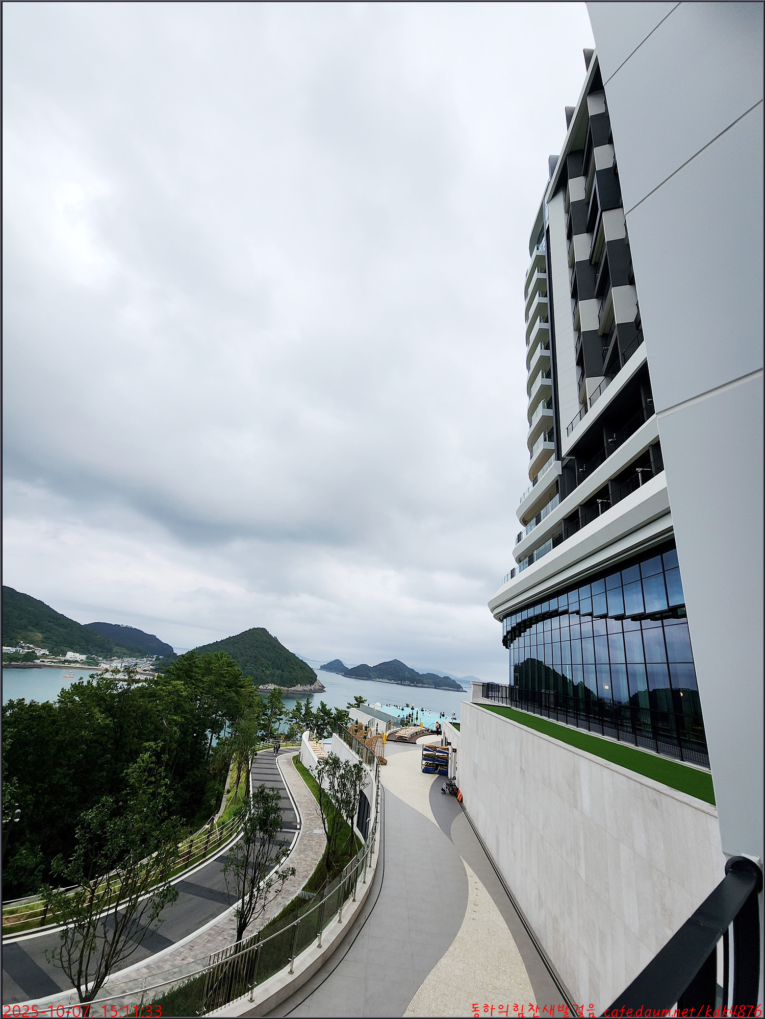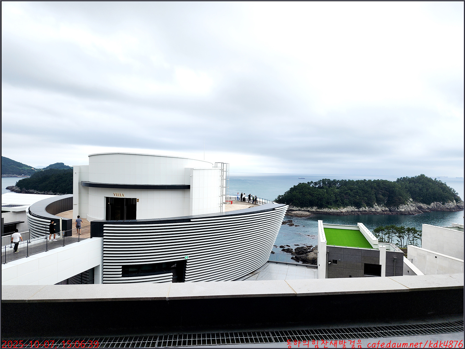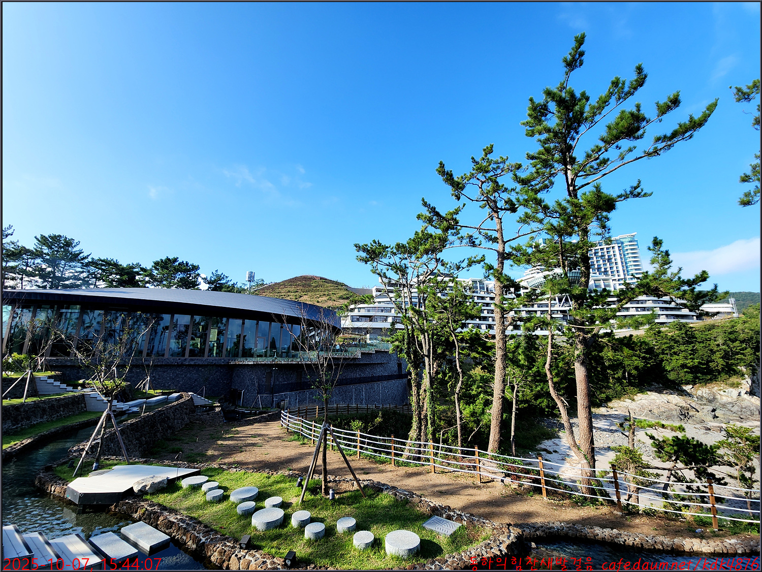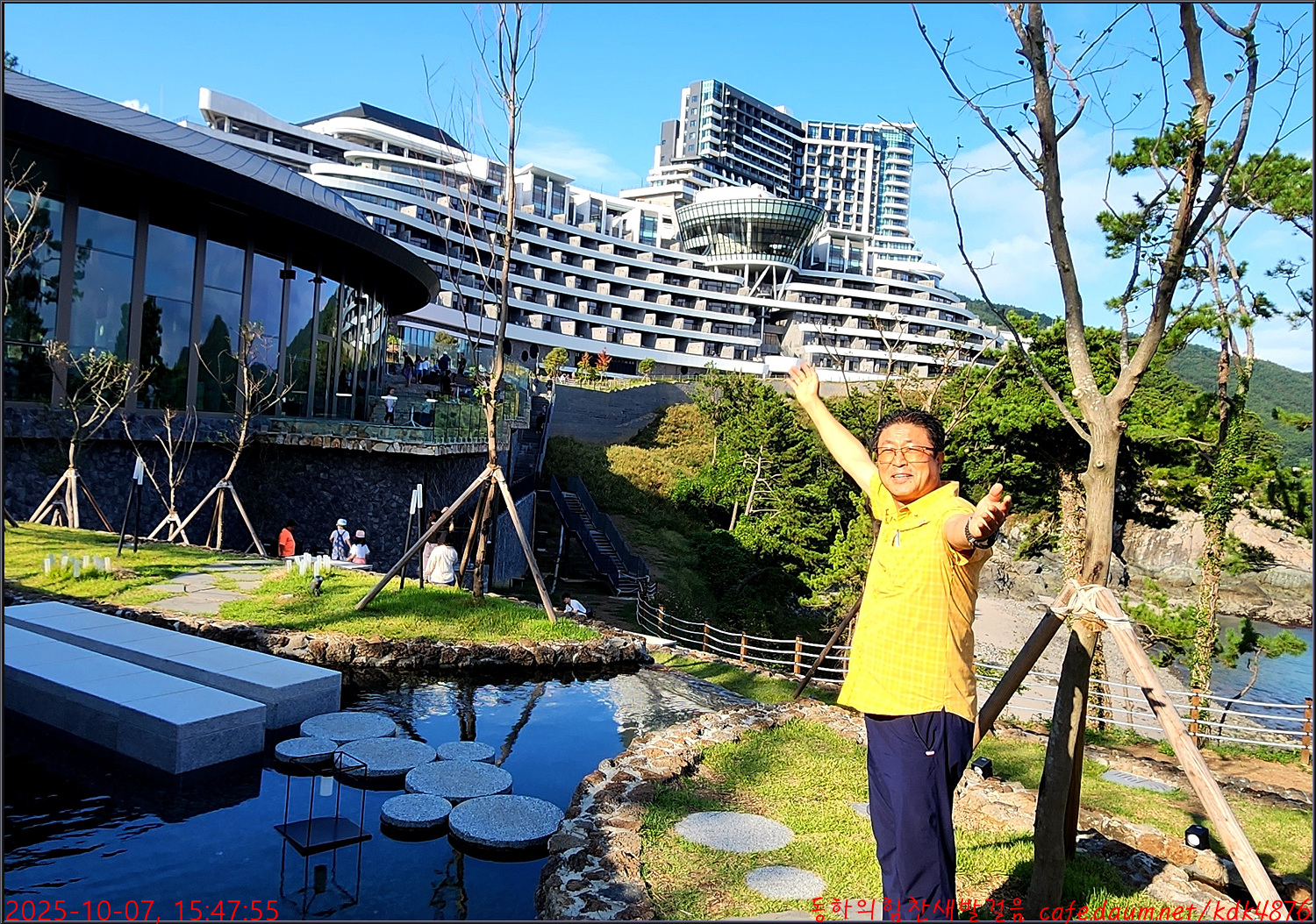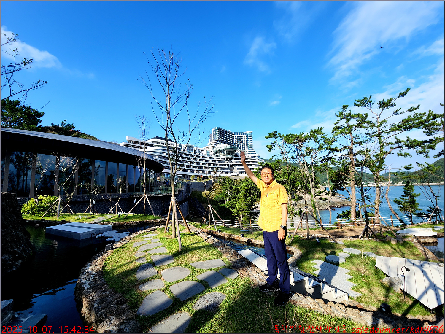 추석연휴 내내 날마다 비가 오락가락한다. 오늘은 해가 나오려나? 모처럼 만에 해를 보니 기분이 좋아지고, 남해 망운산을 향하여 드라이브를 나선다. 그런데 이게 또 웬일? 남해 노량대교를 건너니 부슬부슬 비가 내리고, 망운산 정상부는 구름이 잔뜩 끼었다~ㅠㅠ. 망운산은 포기하고 그냥 한 바퀴 돌아보자~ 하고 가는데 '쏠비치남해' 이정표가 보인다. 남해군의 맨 남쪽 끝자락 미조면에 새로이 들어선 '쏠비치남해'는 지난 2025년 7월에 개장을 하여 인기몰이를 하고 있단다. 위쪽에 자리한 호텔, 아래쪽에 자리한 풀빌라가 아름다운 해안과 잘 어울리도록 웅장함을 곁들여 참으로 멋지게 건설되었다. 호텔로비에서 이어지는 풀빌라의 옥상에는 "Permaent Gift_camellia" 란 작품이 있어, '영원한 선물 동백, 영원한 사랑의 선물'로 소개되어 있다. 풀빌라를 통과하여 해변으로 나서니 '비스트로게미'란 건물과 해변 정원이 꾸며져 있어 여유로운 발걸음으로 천천히 산책을 이어간다. 해변정원에서 바라보는 비스트로게미, 풀빌라와 호텔 건물은 참으로 조화스러운 아름다움을 자랑한다. '솔비치남해'의 웅장함과 아름다움을 감상하며 한바퀴 산책을 마무리한다.
