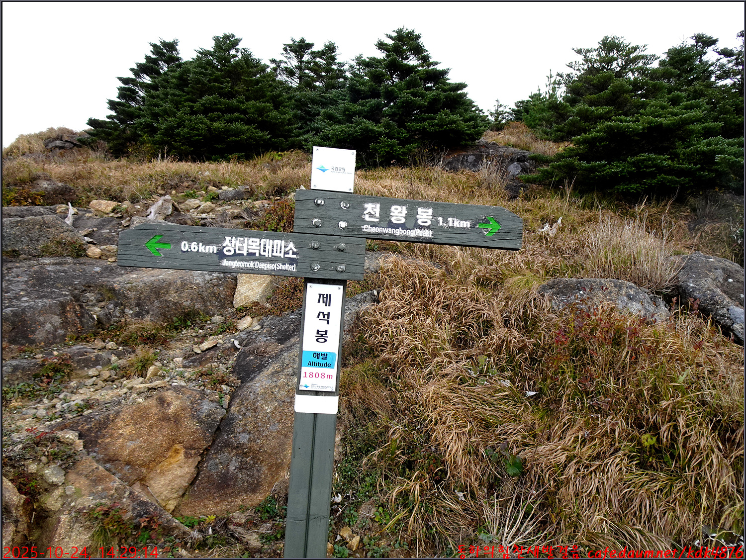 제석봉 해발 1,808에 도착, 장터목대피소 0.6km 방향으로