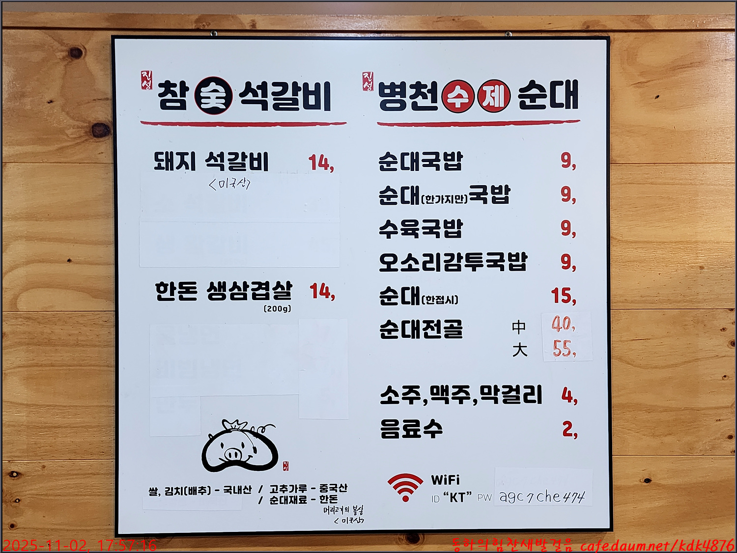 참숯석갈비 병천수제순대 차림표,