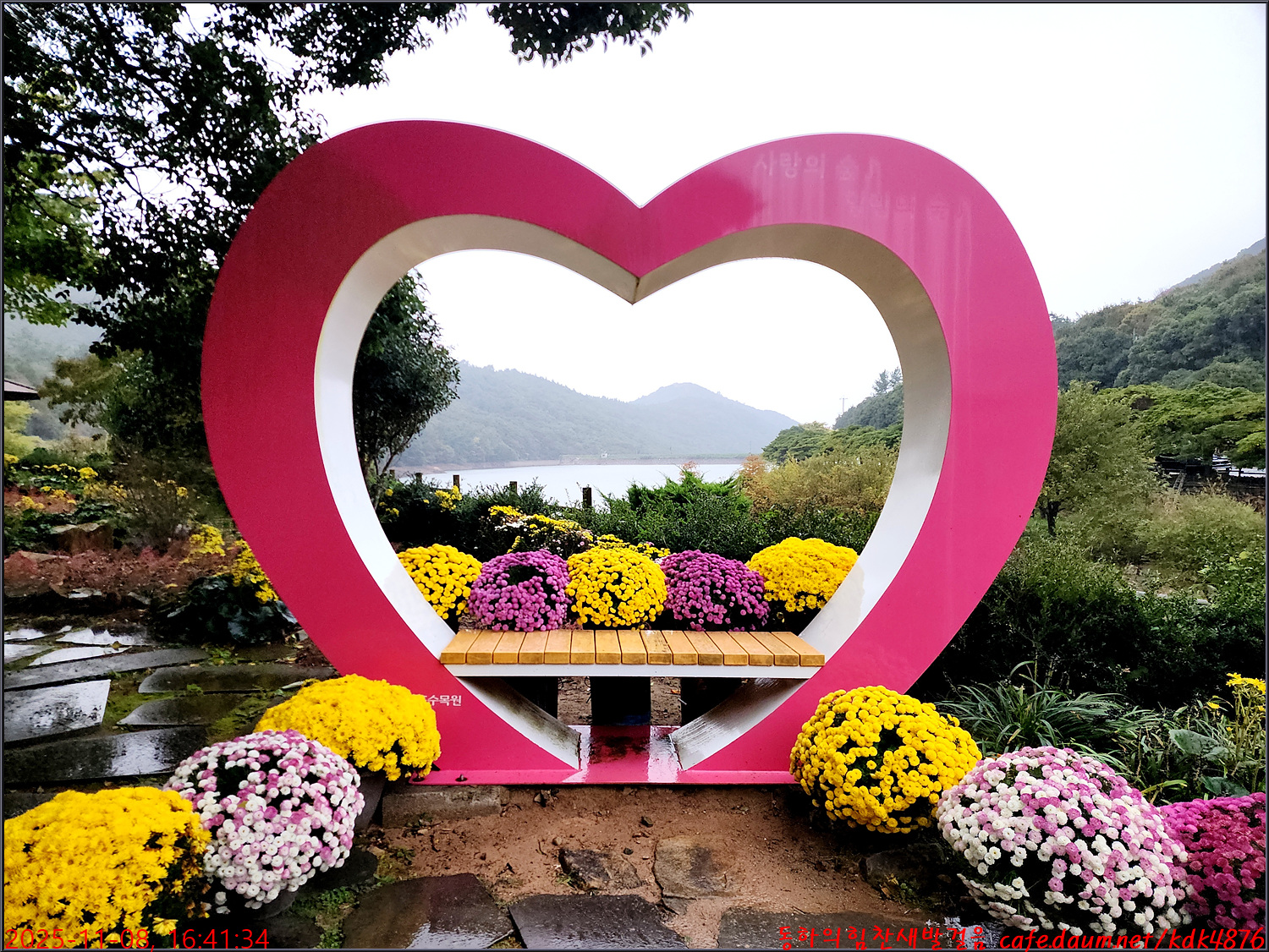 울긋불긋 가을국화로 장식되어 있는 하트 포토존 뒤로는 신학저수지