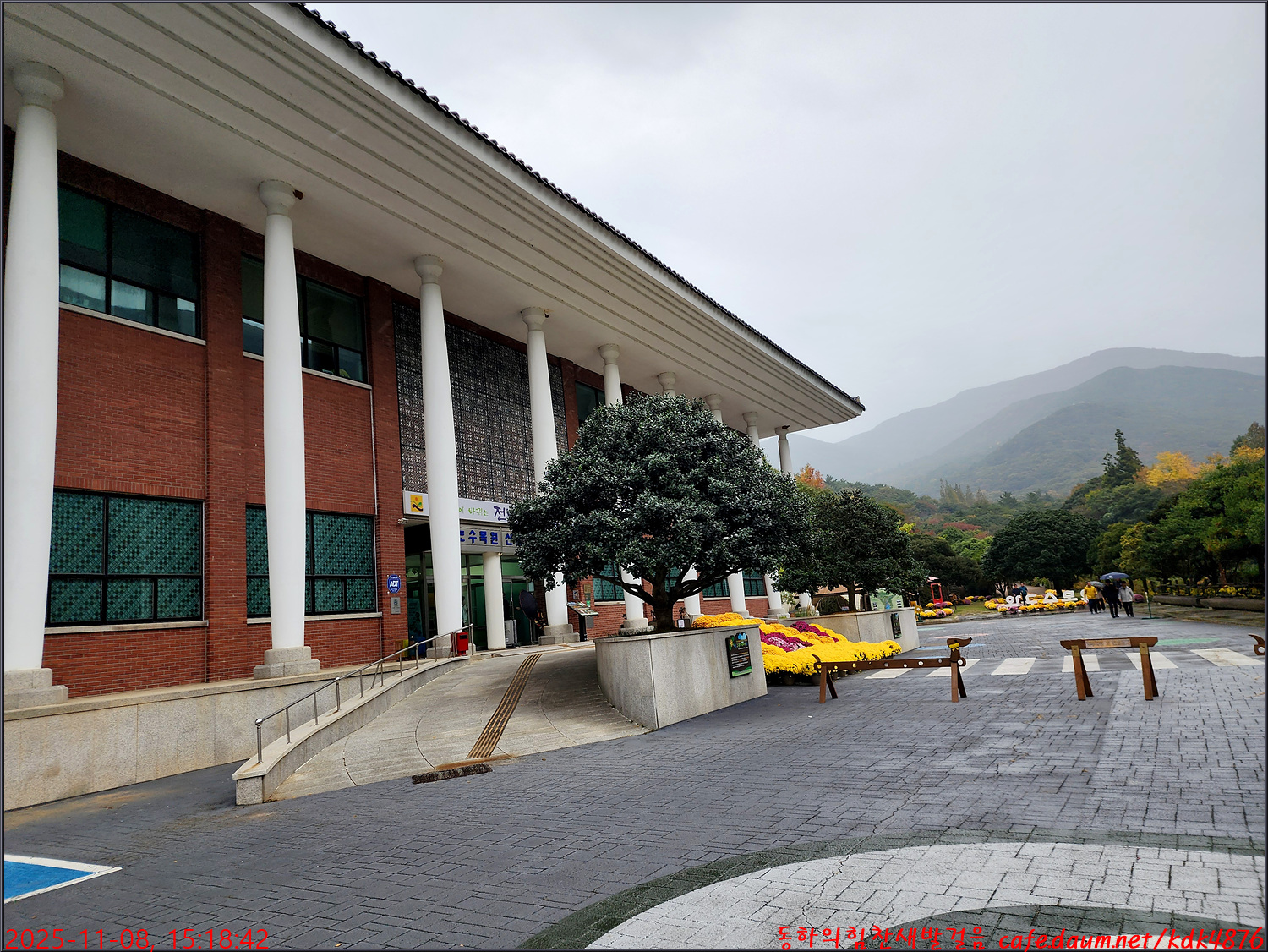 웅장한 건물의 산림전시관 계단에는 가을국화가 예쁘게 전시되어 있고
