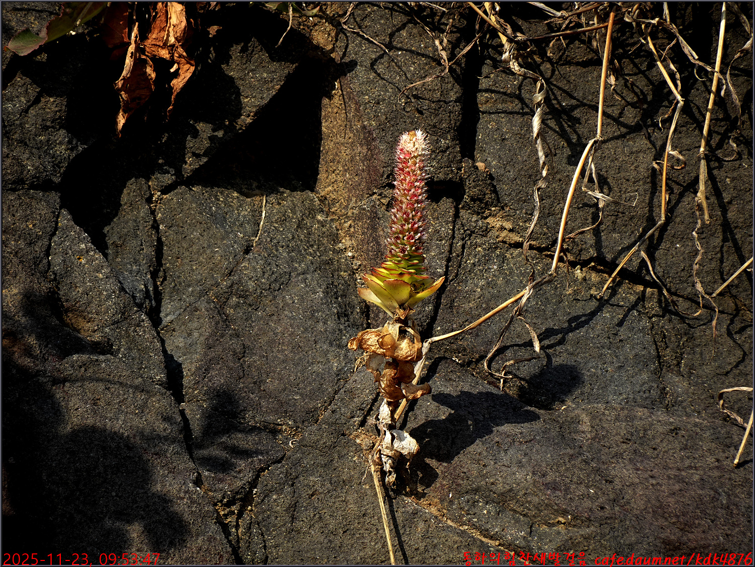 거대한 바위의 작은 틈에는 귀여운 와송이 자라고