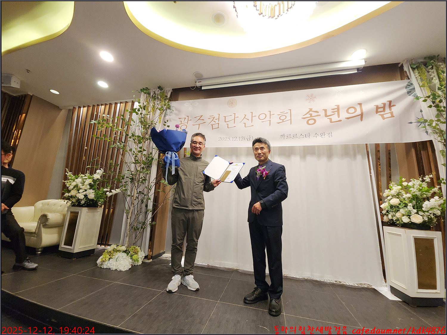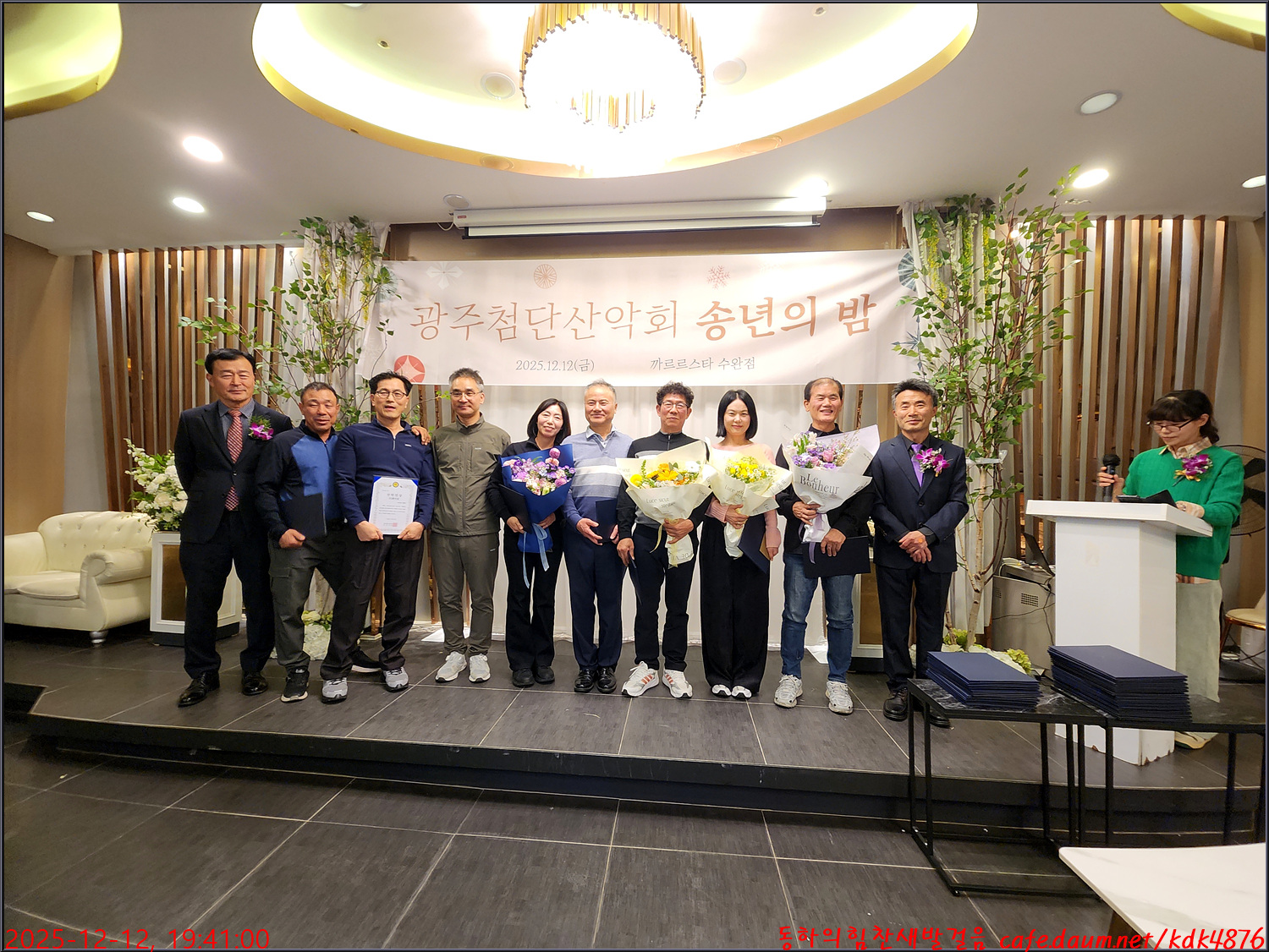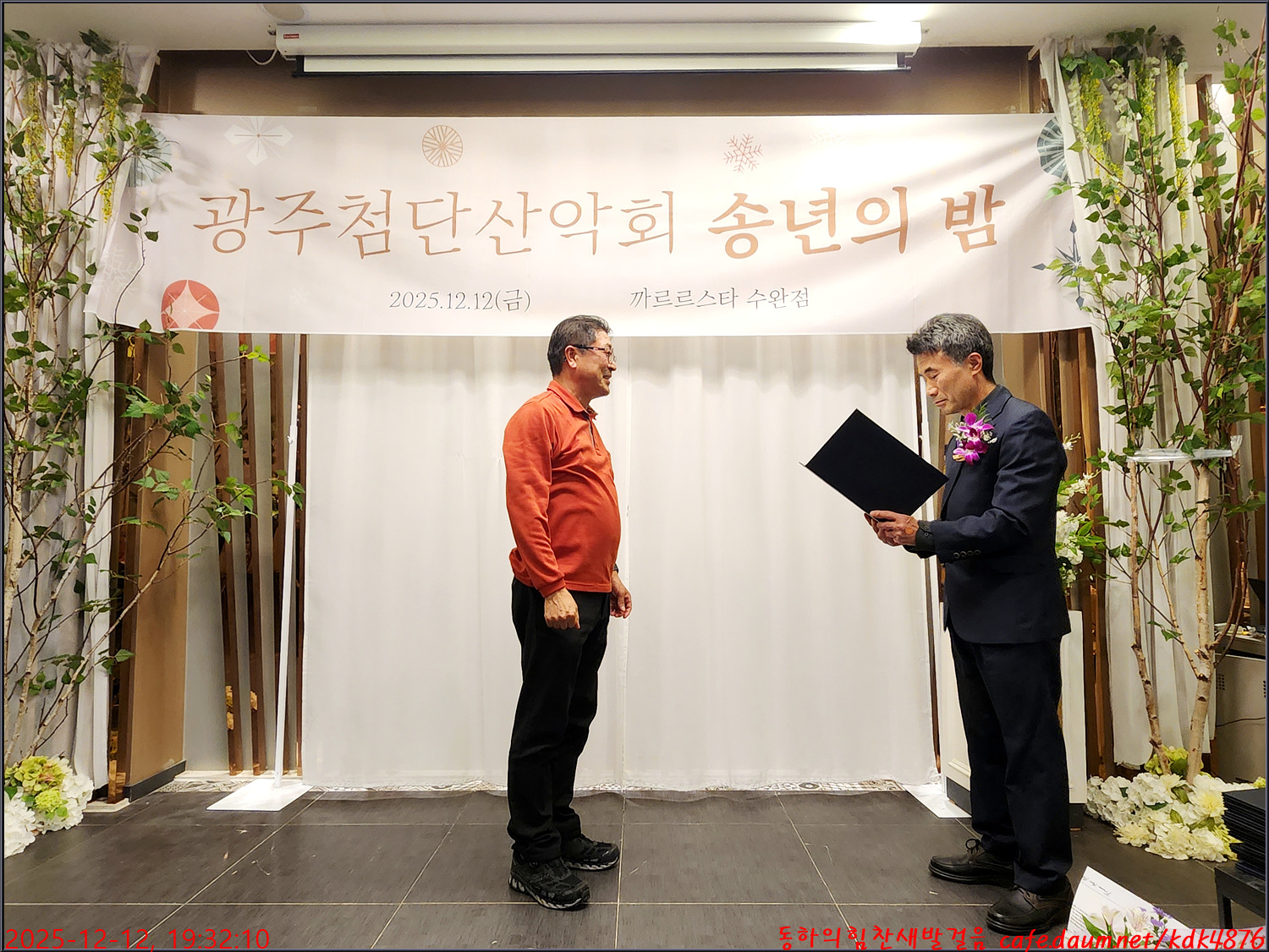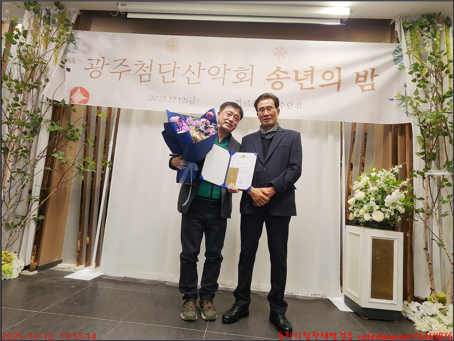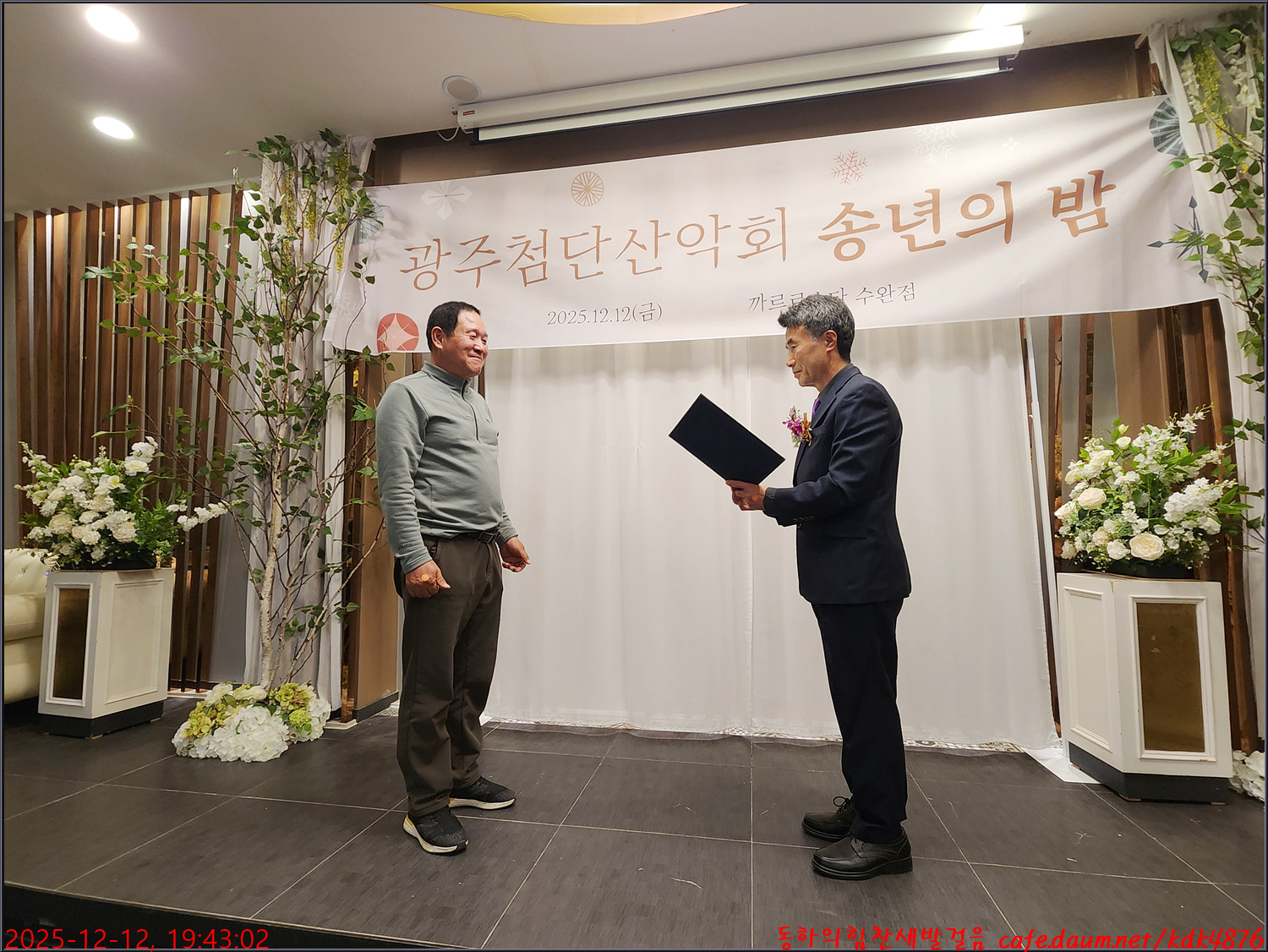 | 251212_광주첨단산악회 2025년도 송년회(송년의 밤) 및 회장 이취임식 & 임명장 및 표창장_첨단산악회 (1) | 2025.12.13 |