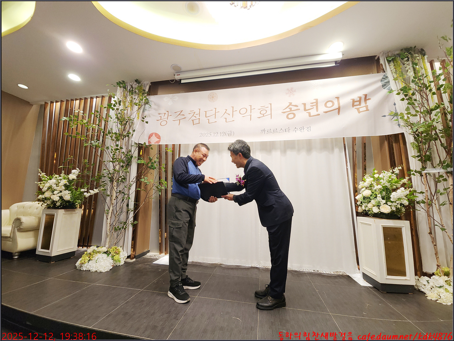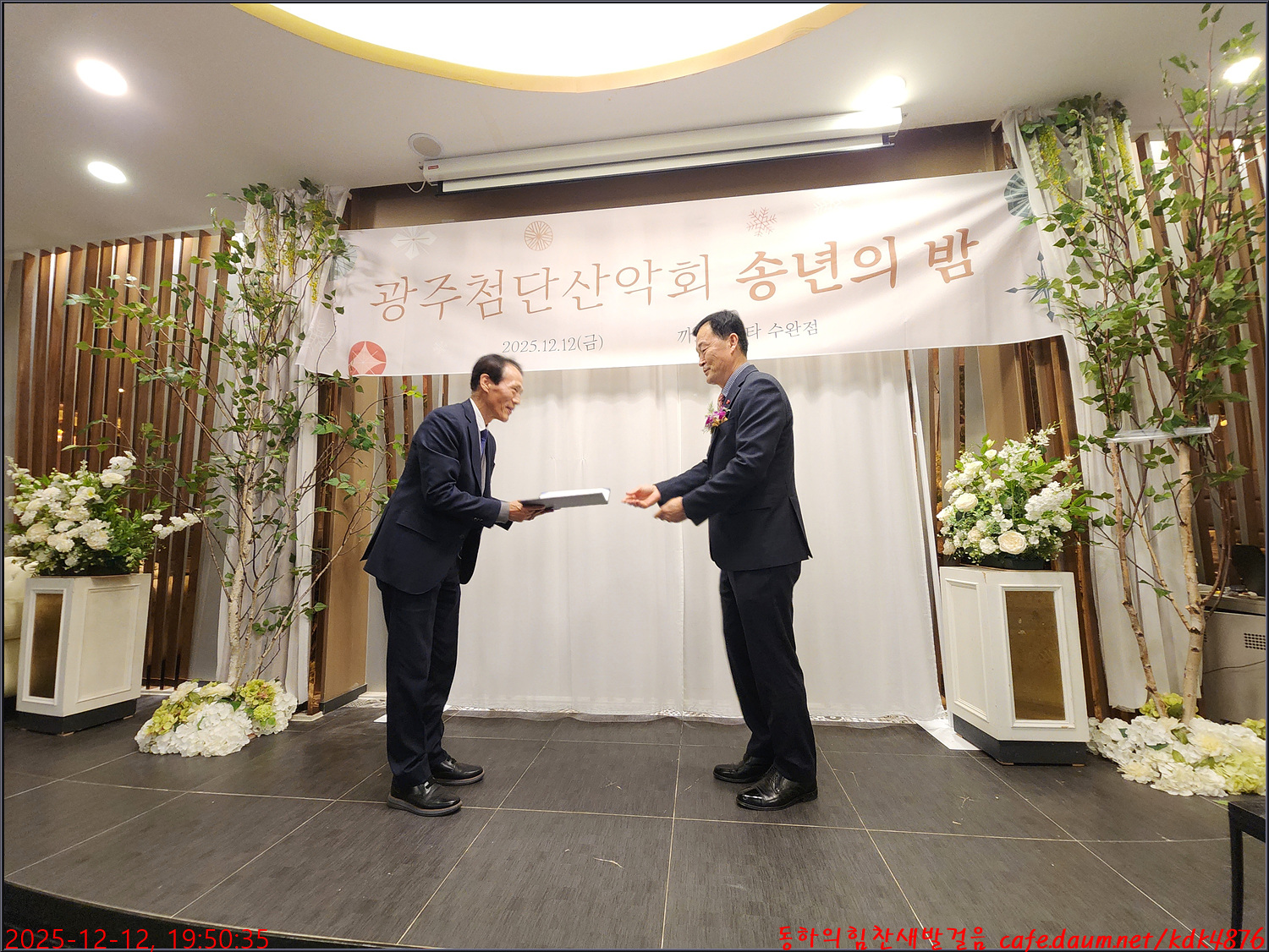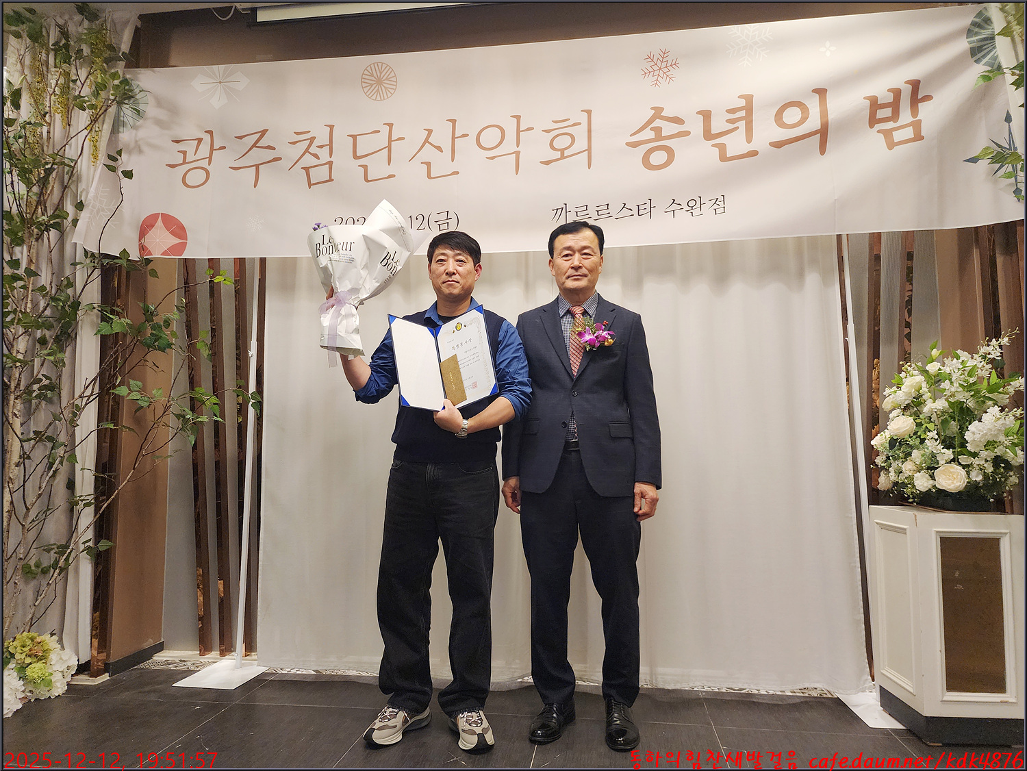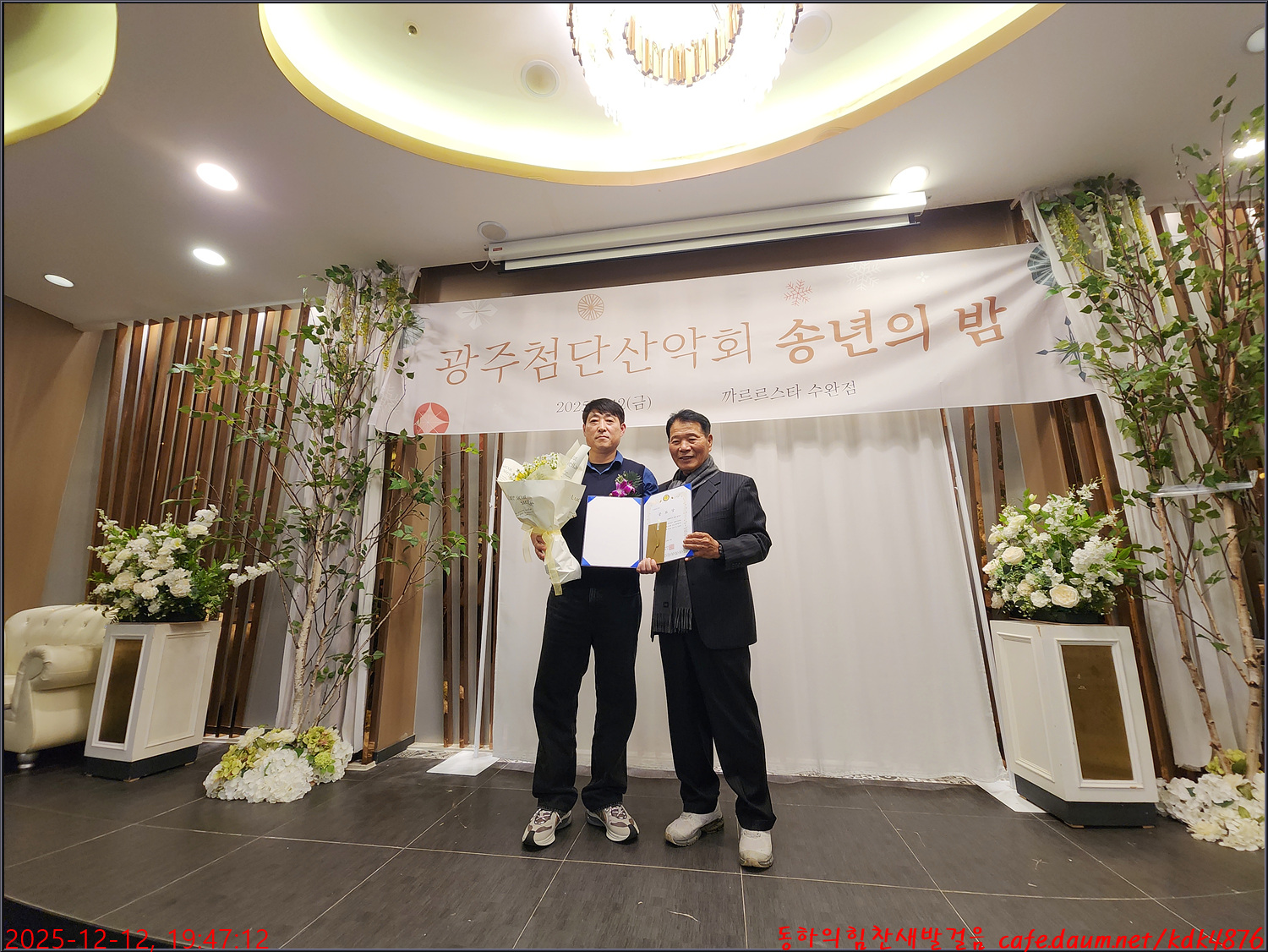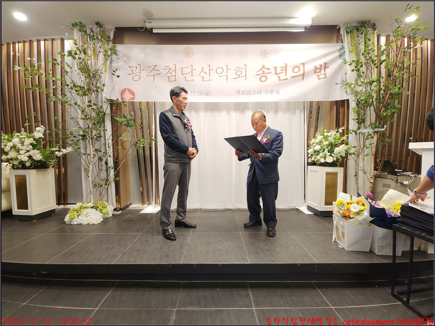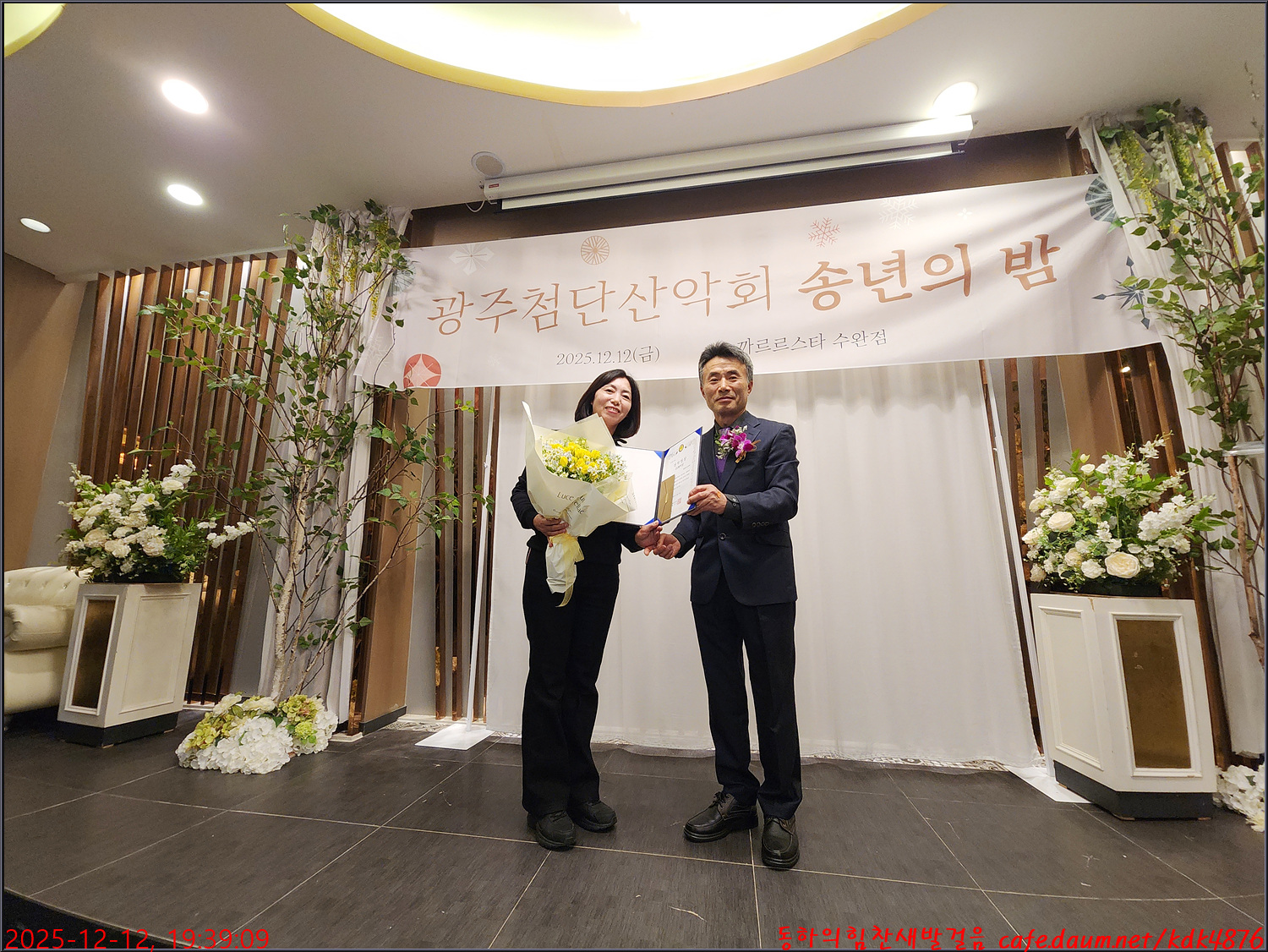 | 251212_광주첨단산악회 2025년도 송년회(송년의 밤) 및 회장 이취임식 & 임명장 및 표창장_첨단산악회 (1) | 2025.12.13 |